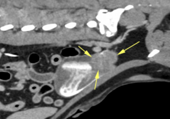 CT is a valuable tool for assessing the urinary system for many conditions, from renal calculi to masses and ruptures. Visualizing the entire urinary system in both pre- and post-contrast images is vital for excluding a wide range of possible pathologies. The pre-contrast phase enables identification of the bladder and both kidneys, and to assess for calcified lesions which could be causing hematuria. Contrast-enhanced urine could mask this pathology.
