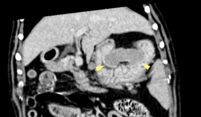 Image 3: Dorsal reconstruction of a post-contrast scan showing a large mass in the gastric fundus (arrowheads).