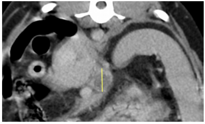 Image 4: Axial slice of a post-contrast scan showing an enlarged left hepatic/portal lymph node with hypoattenuation ( yellow line indicates extent of dorsoventral width).