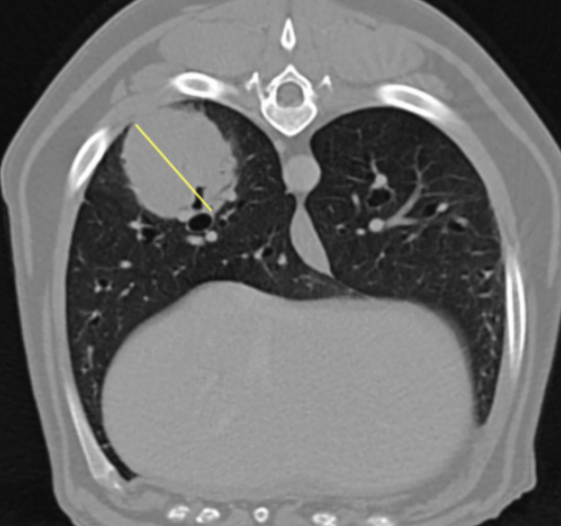 When imaging the thorax, it is important to have thin-enough slices to identify any subtle changes in the lung tissue.  Equally important is the speed of scan acquisition to capture images when the patient is in induced apnoea. This protocol used 1.25mm slices with 0.625mm intervals, with a 1 second rotation time. This gives an average acquisition time of 19 seconds on an 80kg patient, which is achievable for induced apneoa. The thorax is reconstructed primarily with a lung WW/WL, but soft tissue and bone windows are also done post processing to ensure no pathology is missed. Ideally, the more inflation within the thorax, the more detail shown, and less chance of masked pathology due to collapsed lung fields. Pulmonary carcinomas are common, usually slow-growing masses that cavitate and seed metastases to the lungs and other organs, which makes CT the modality of choice when assessing disease progression.