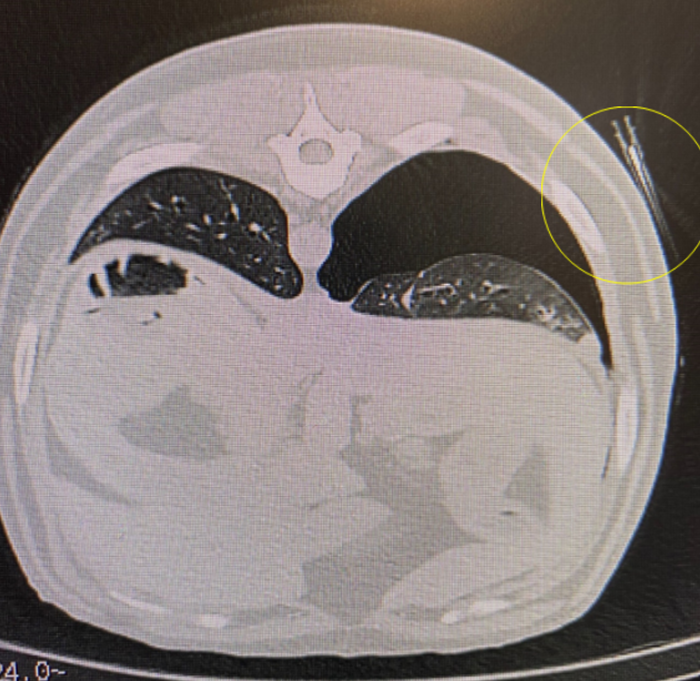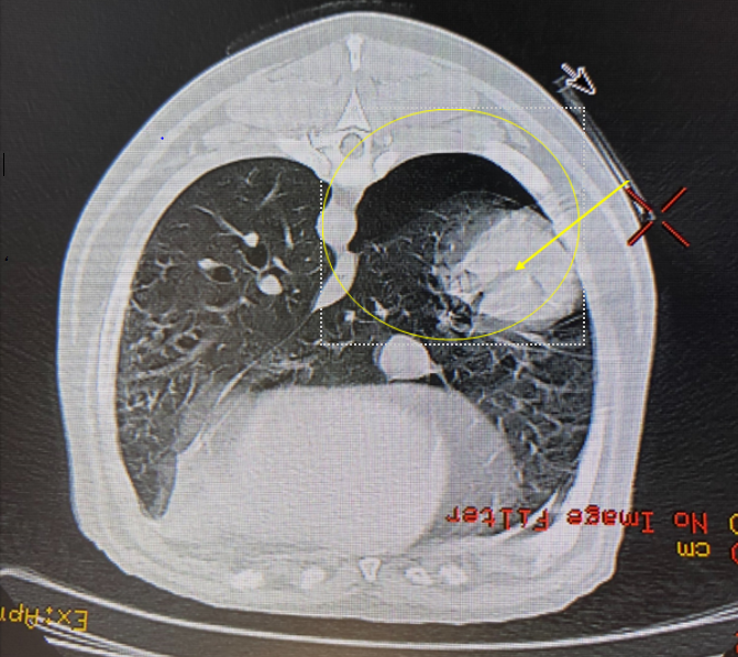 Once we were happy with the location and the measurement of the length of needle required, we took note of the table position and slice number so we could manually input if we needed to move the patient back to the specific slice. We inserted the 8cm needle and re-scanned the slice position to ensure the needle was correctly located in the mass. We loaded this slice into the reformat viewing platform to ensure the correct location, and then returned to the room and moved the patient out to obtain the samples. After the biopsy samples are acquired, it is protocol to perform another scan through the thorax to check for bleeding and pneumothorax. There was a small iatrogenic pneumothorax present, which would be monitored by rescanning in either 12 or 24 hours and continued clinical observation of the patient.  The patient’s pneumothorax was resolved by the next day and he was sent home to await results of the biopsy. Results of the biopsies obtained came back with the confirmed diagnosis of lymphoma.