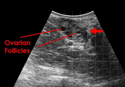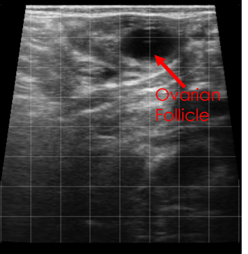 This image shows multiple small ovarian follicles. The fluid filled follicles appear anechoic (black) and are surrounded by the stroma of the ovary (red arrow).