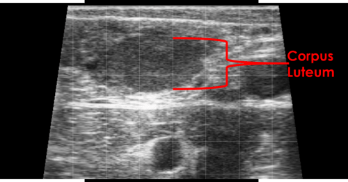 The corpus luteum appears as a defined area of hypoechoic tissue within the ovarian stroma.