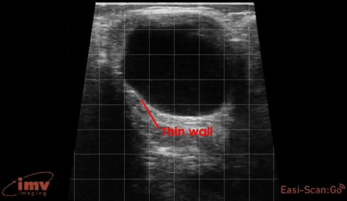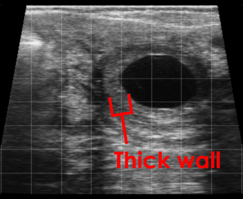In this image, a large fluid-filled follicular cyst can be seen. Note the thin wall of the cyst.
