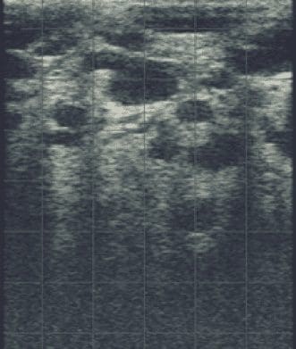 Figure 3 is an ultrasound image of a bovine udder affected with mastitis caused by Trueperella pyogenes. This is characterized by the presence of multiple, hypoechoic regions throughout the parenchyma. Bacterial milk culture confirmed the causative agent.