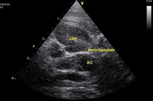 An aortic embolism was identified at the trifurcation and was occluding the majority of the blood flow to the right iliac artery. Both kidneys had evidence of mild pyelectasia possibly as a result of fluid therapy. The liver was enlarged and hyperechoic which may have been related to endocrine disease. The stomach and intestinal tract were unremarkable. The urinary bladder was small.