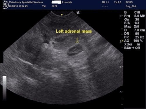 A left sided adrenal mass was identified with no obvious signs of invasion into the major vessels. The maximum width was 0.9cm and the adrenal had lost its peanut shape. The right adrenal was unremarkable.
