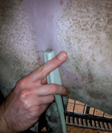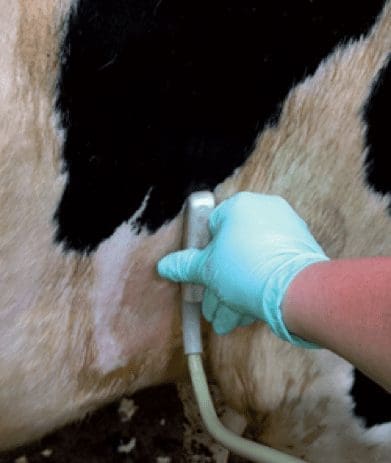 When evaluating the lung and pleural surface. The probe is initially placed in the intercostal space immediately caudal to the point of the elbow. And moved along the intercostal space in the dorsoventral direction (parallel to the ribs). See Figures 1 and 2 for probe placement in cattle and sheep.