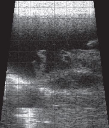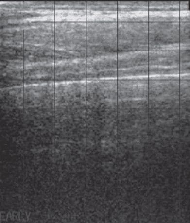 The presence of air within the normal lung prevents the ultrasound waves from penetrating deeply into the lung parenchyma. Therefore, the highly reflective pleural surface which is in contact with aerated lung. Is readily identified on ultrasound as a uniformly hyperechoic line which moves in synch with respiration. Figure 3 shows the surface of the lung in a normal cow with no evidence of pulmonary disease.