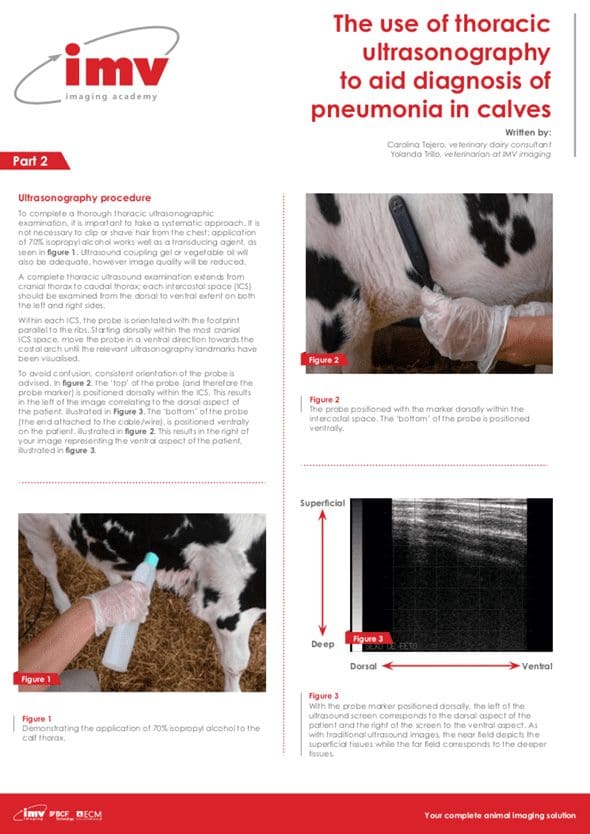 To complete a thorough thoracic ultrasonographic examination, it is important to take a systematic approach. It is not necessary to clip or shave hair from the chest; application of 70% isopropyl alcohol works well as a transducing agent, as seen in figure 1. Ultrasound coupling gel or vegetable oil will also be adequate, however image quality will be reduced.