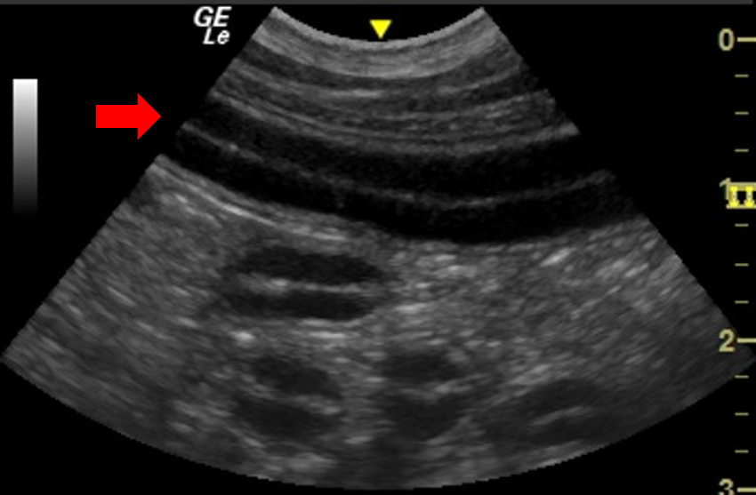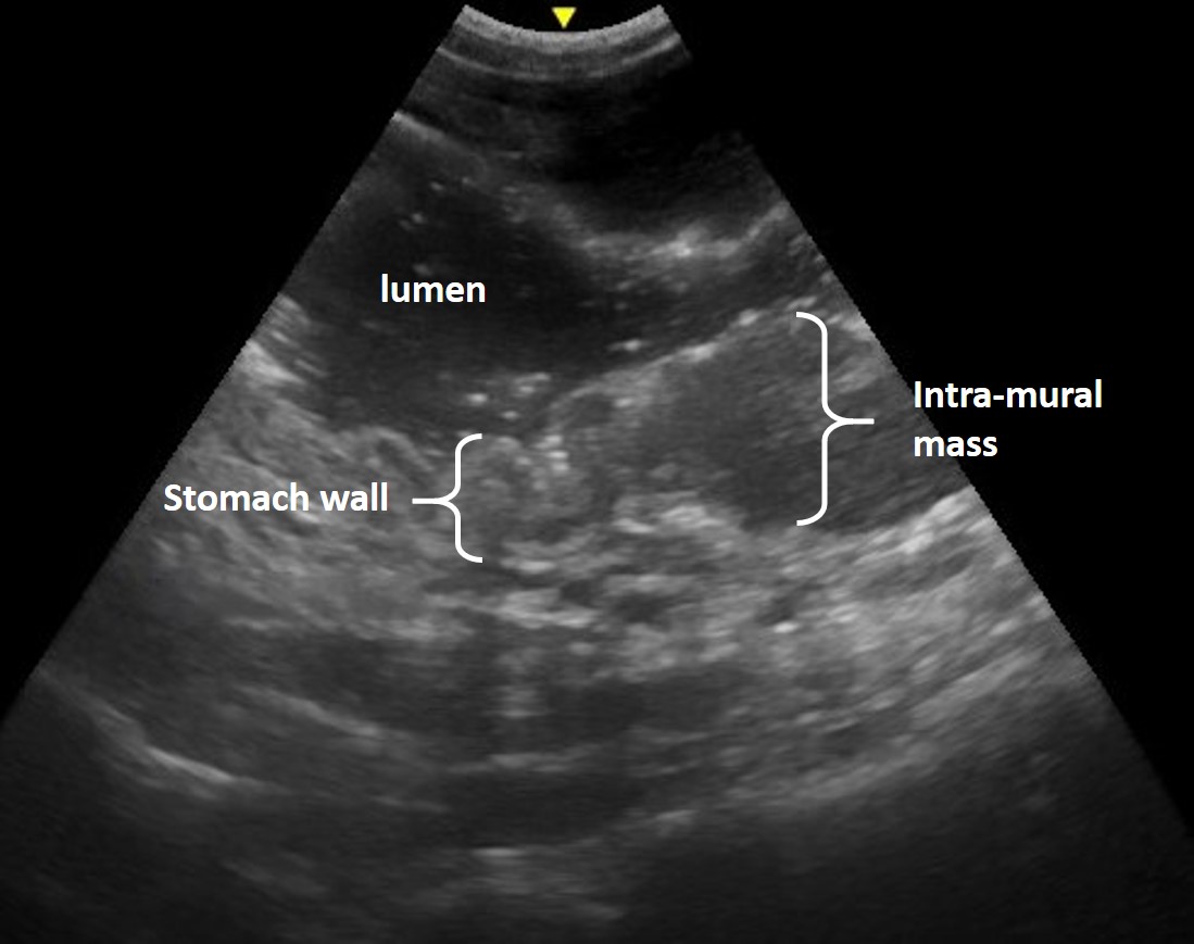 One of the major limiting factors when attempting to image the GI tract is the presence of gas within the lumen. Reverberation artefact caused by gas prevents visualisation of the far field, often preventing complete evaluation of structures. Preparing the patient by withholding food for 12 to 24 hours prior to examination is recommended. It is important to remember that certain drugs and the stress or confinement of hospitalisation can also alter GI motility. A high frequency linear or micro-convex transducer (7mHz or higher) should be used to enable assessment of wall layering. The smaller footprint of a micro-convex probe facilitates the use of the intercostal spaces to achieve views of GI structures.