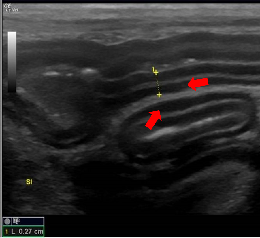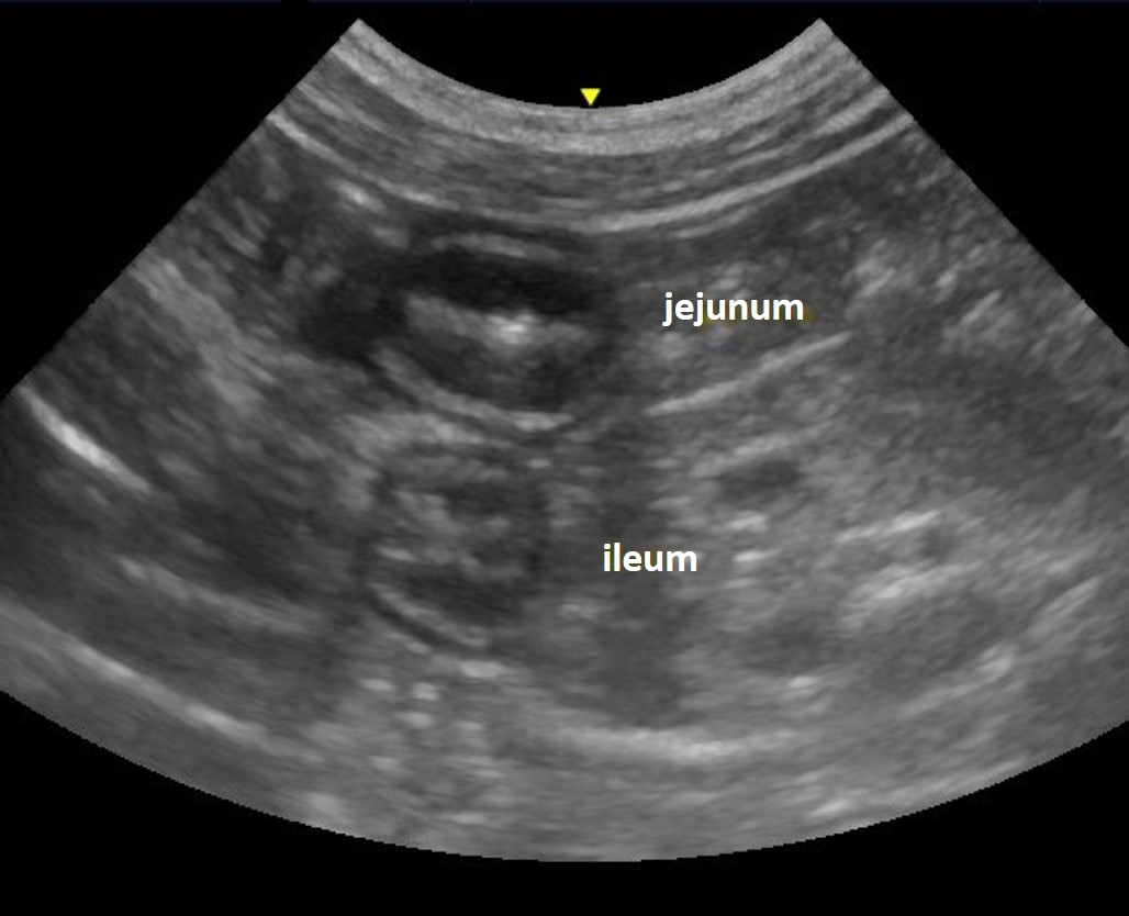 Figure 6. Ileum – The ileum and a loop of jejunum are imaged in cross section in the same image. Note the difference in the appearance of the lumens; a rosette or star shaped appearance in the ileum, compared to a more linear appearance in the jejunum. The submucosa has a more pronounced and hyperechoic appearance in the ileum.