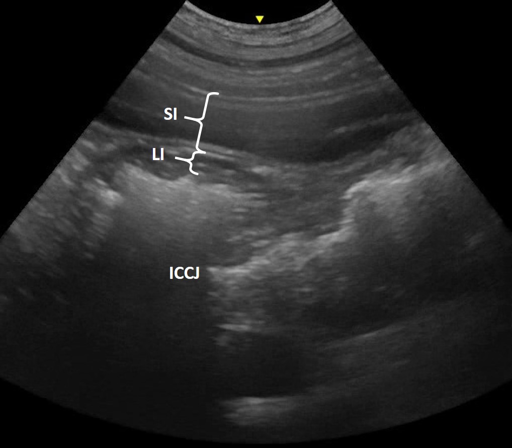 Figure 7. Large Intestinal Wall Thickness – In this sagittal plane image of the right abdomen of a dog the ileo-caeco-colic junction (ICCJ) can be seen. The duodenum is visible in the near field (SI); note the marked difference in overall wall thickness between the small (SI; both walls highlighted) and large (LI; one wall highlighted) intestine.