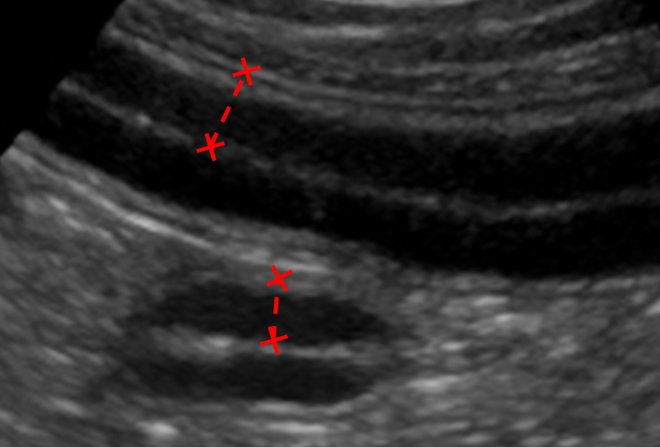 Figure 3. An ultrasound image showing 2 sections of small intestine. Two callipers (crosses with linked dotted line) have been placed to measure intestinal wall thickness, from the inner edge of the mucosa outwards to the outer edge of the muscularis layer.
