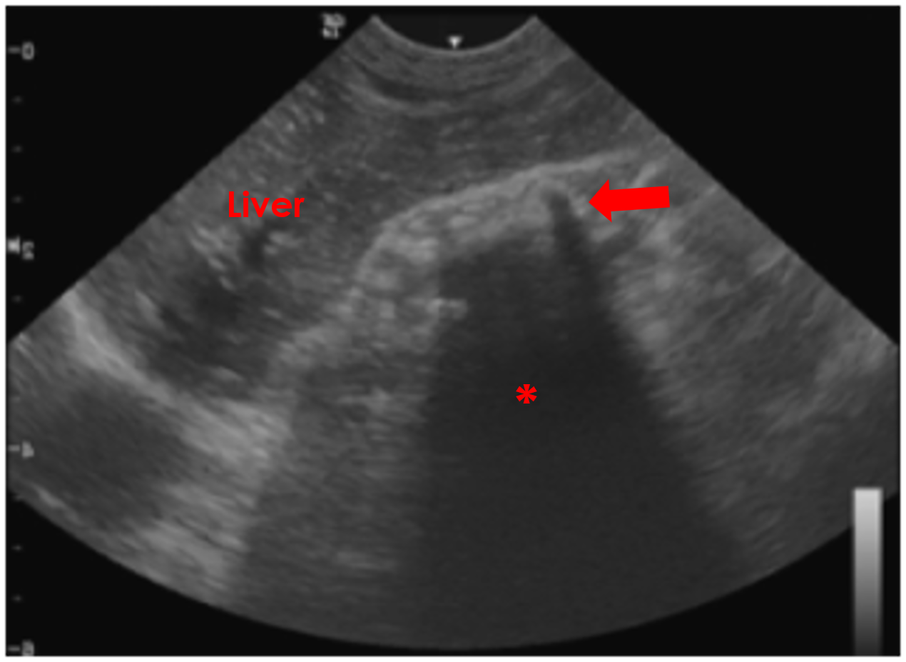 Figure 12. Gastric Foreign Body – In this sagittal oblique image of the cranial abdomen of a dog, a plastic foreign body in present within the gastric lumen (arrow). The dense plastic of the foreign material is preventing the ultrasound waves penetrating deeper into the patient and creating an acoustic shadow artefact (*).
