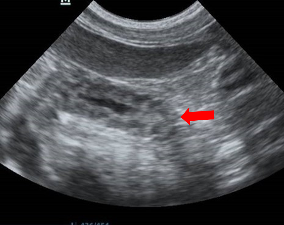 Figure 5. Duodenum – In this sagittal plane image of the right dorsal abdomen of a dog, the duodenum (arrow) an be visualised in longitudinal section. Deep to the duodenum, multiple loops of jejunum in transverse section can be seen.