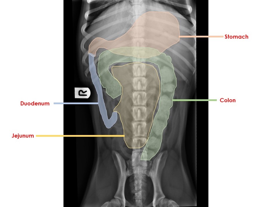 Figure 1. This ventrodorsal abdominal radiograph has been annotated to give a schematic representation of the position and course of parts of the GI tract in a dog. In cats, the stomach is orientated more obliquely, and the pylorus and duodenum are positioned closer to the midline.